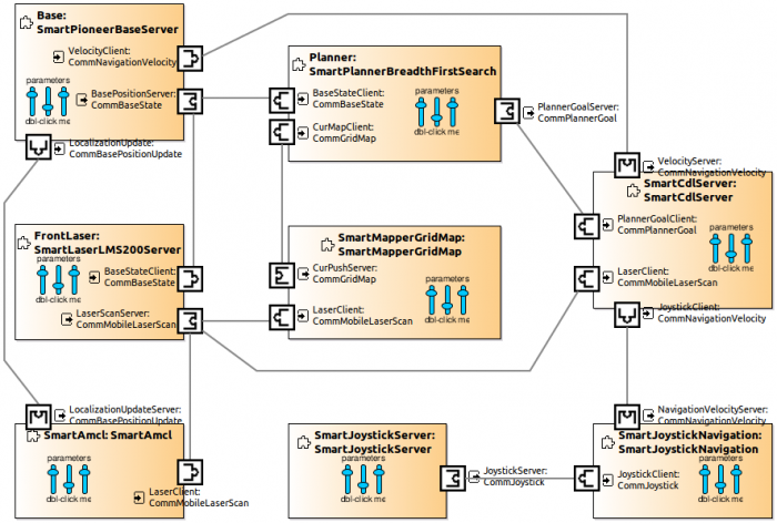 The figure below shows an example model of the navigation scenario. This model enables System Builders to instantiate and compose components to a system and to specify initial wiring as well as initial configurations of these components.