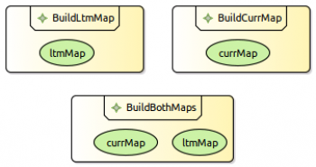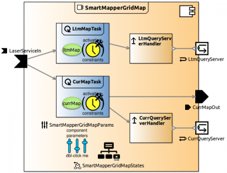 As an example for a more complex component, the figure above provides the model of the “SmartMapper” component. This component provides three services, namely “LtmQueryServer”, “CurrQueryServer” and “CurrMapOut”. The first service provides a long-term map while the other two services provide access to the current map (i.e., a grid-map of a local section from the long-term map). The component internally maintains and updates both map types. There are different situations at runtime, where either one of the map types is needed, or both map types are used, or none of the map types is currently needed. The model of the component's operation modes (see figure on the right) supports all these cases. As can be further seen in the component model (in the figure above) the “LtmMapTask” activity is only active if one of the operation modes “BuildLtmMap” or “BuildBothMaps” is active. Respectively, the “CurrMapTask” activity is only active if one of the operation modes “BuildCurrMap” or “BuildBothMaps” is active. Please note that the “neutral” operation mode is not explicitly modeled as it implicitly exists for every component by default.