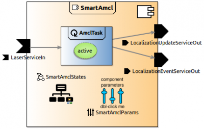 As an example, the figure on the right shows the model of the “SmartAmcl” component (i.e., a component providing a localization service based on the “Adaptive Monte Carlo Localization” approach). This component internally specifies a single activity called “AmclTask”. Moreover, the “AmclTask” is mapped to the component's operation mode called “active” (see green ellipse in the figure). As stated above, the component's lifecycle does not need to be explicitly modeled as it is implicitly available for each component by default. Additionally, the component's lifecycle provides two default operation modes called “active” and “neutral” (as part of the “Alive” submachine within the component's lifecycle). That is, if the “active” operation mode is activated, then the referenced activity “AmclTask” is activated thus consuming the relevant resources. By contrast, switching into the “neutral” operation mode implicitly deactivates the operation mode “active” and thus the referenced activity “AmclTask”. In other words, the component is conveyed into a “standby” mode thus releasing the relevant resources.