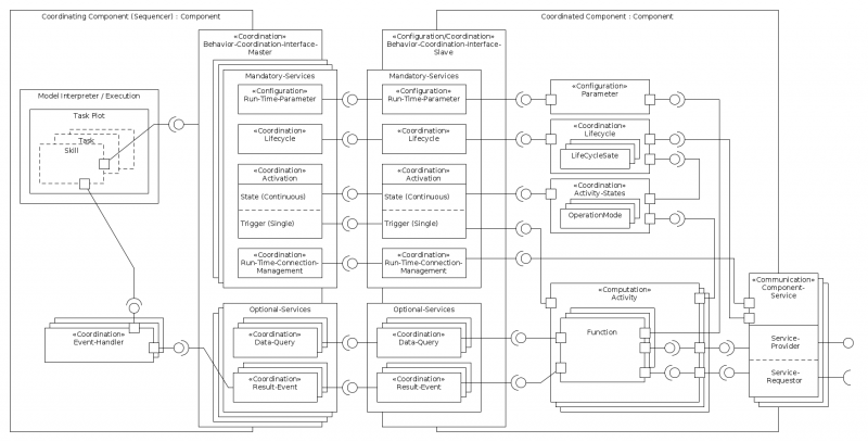 Functionalities within closed software components needs to be coordinated to so that the robot as a whole is able to provide a service. The access to the functionalities within the components needs to be on a balanced level to avoid fine grained interaction, so that the user of the software component does not need to know implementation specific details of the component.