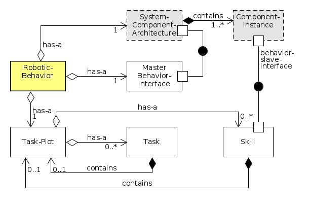 The Robotic Behavior Metamodel defines structures for modeling task-plots of a robot (see figure below). Task-plots define sequences of tasks required to achieve certain goals at run-time. Each task itself can contain another task-plot. This introduces hierarchy into the task-plot modeling where high level tasks (such as e.g. making-coffee) are refined into lower level tasks (such as e.g. approach the kitchen, operate the coffee machine and bring the coffee back to the customer). At the lower end of the abstraction hierarchy, tasks eventually operate (i.e. to coordinate and configure) according software components that do the actual “work” of a task. In this sense, tasks are passive, they just delegate the work to components in the system and await the results (i.e. success or failure). The interaction between task-plots and components is over skills. In this sense, a skill abstracts the technical coordination interface of a component and makes it accessible for task-plots. A skill by itself might “inject” additional task-plots. This feature is particularly useful for modeling alternative behaviors in case of contingencies in the overall behavior. For example, a skill commanding a navigation component to approach a room might get the result that the navigation component failed to do so (e.g. due to a blocked hallway). In this situation, the according skill might inject an alternative strategy, namely to first go to another location and to try the current task later (or whatever other strategy might be appropriate here).