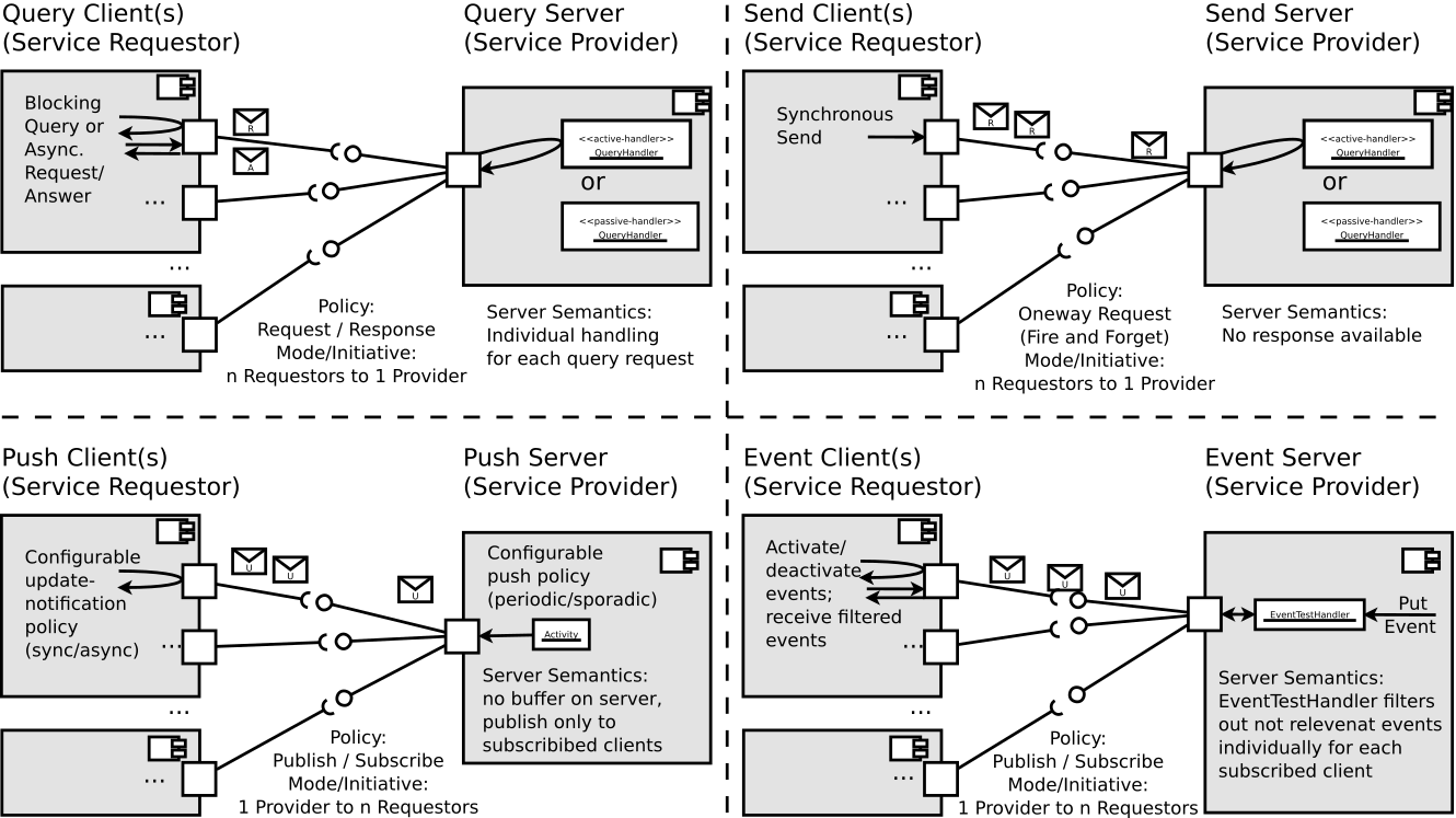 The four communication patterns (see table below) define the basic set of recurring communication semantics that proved to be sufficient for all robotics use-cases related to inter-component communication at the service level (for service level, see Separation of Levels and Separation of Concerns).