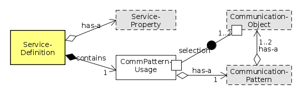 A Service allows interaction (i.e. regular exchange of information) between software components. A Service consists of service-properties (defined in an external metamodel) and a communication-pattern-usage. The communication-pattern-usage selects a certain Communication Pattern with a pattern-specific selection of according number of communicated data-structures (i.e.Communication Objects).