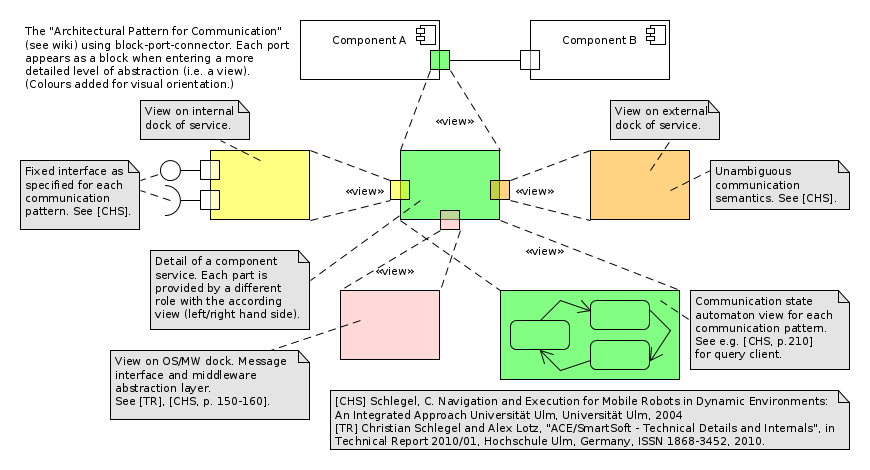 This pattern can be applied recursively, where the ports of the currently more detailed view can again contain additional internal structures (not visible for the current role). For instance, a the “external” port of a service (see orange block on the right in the figure below) provides sufficiently detailed and stable communication semantics between interacting components (defined through a selected Communication Pattern). Second, the “internal” port of a service provides a clear API towards implementation within a component (also defined as part of the Communication Pattern). Third, the “bottom” port of a service provides a generic middleware abstraction layer that allows using any general purpose communication middleware without affecting the communication semantics (see Communication Objects).
