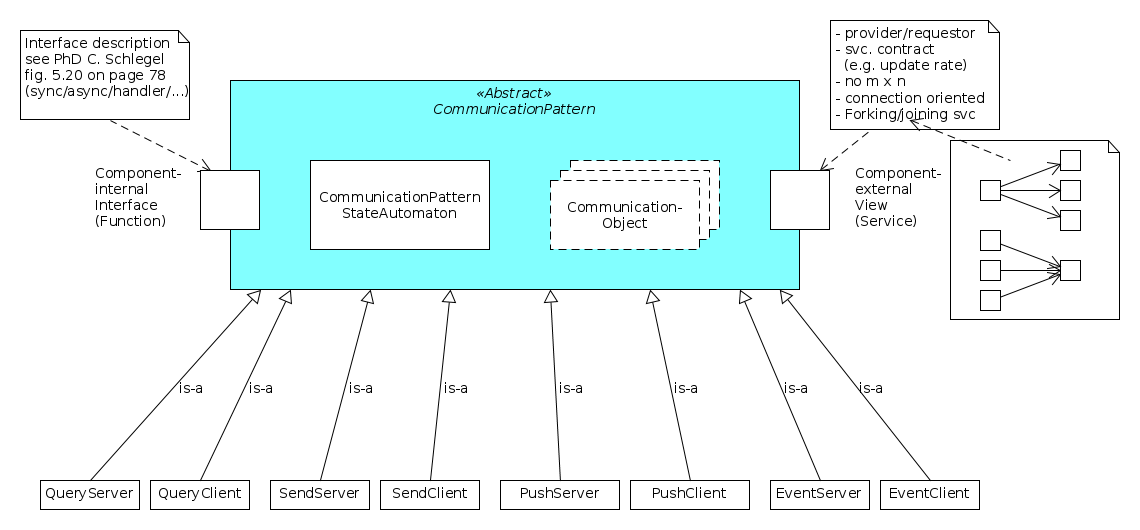 The communication patterns consist of an internal and external view of the component interface. The external view is defined by the behavior of the communication pattern itself. References therefore are provided in Communication-Pattern Metamodel.