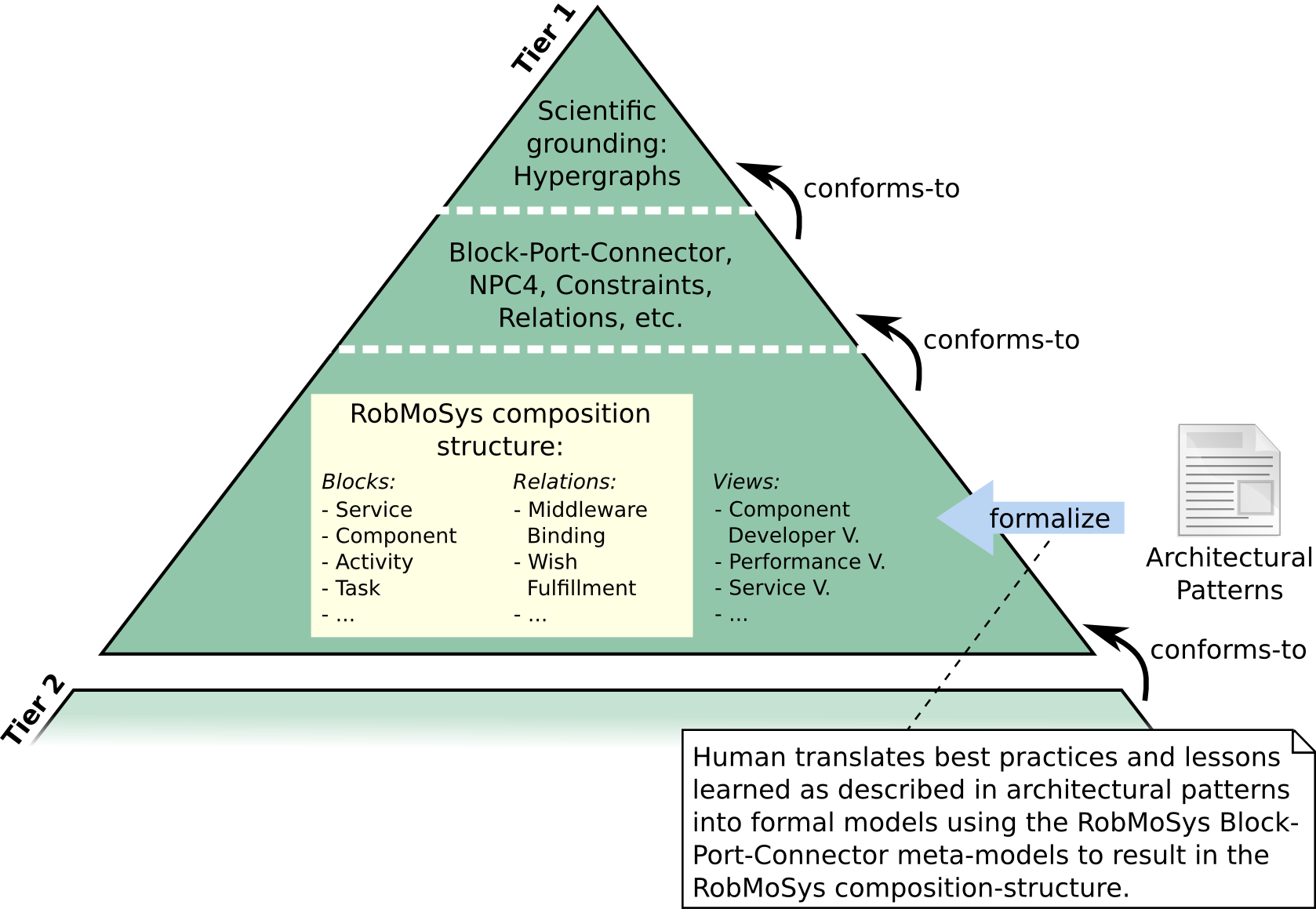 RobMoSys allows the definition of domain-specific models and structures at composition Tier 2. To illustrate this concept, RobMoSys defines the following extendable content for Tier 2.