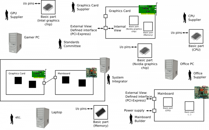 In the PC industry, different ecosystem participants can supply and use building blocks to flexibly compose systems based on their needs. There are graphics card suppliers that do not know where their product is being used or for what purpose. They supply their graphics card and adhere to an specified interface (e.g. PCI express) to make sure it can be used with any mainboard. They can build their graphics card using off-the-shelf building blocks (e.g. Nvidia graphics chip and standard memory). They provide data sheets for the graphics card that specifies the properties of the product which are necessary to use it. The data sheet does not need to expose internal details or layouts (protected IP) of the graphics card.