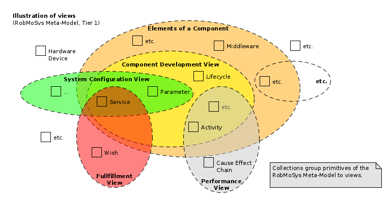 The concept of “views” groups basic primitives of the RobMoSys composition strucures. A view is related to a role and establishes the link between primitives in the RobMoSys composition strucures and the RobMoSys roles.