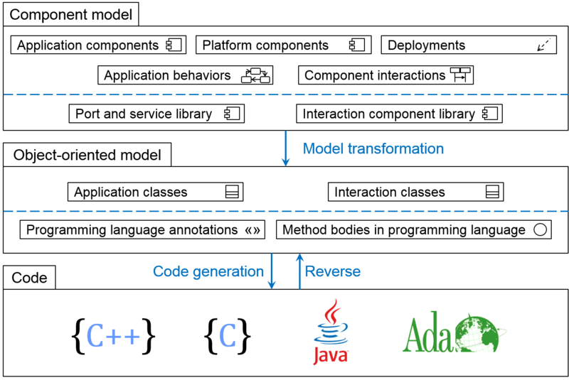 In addition to DSLs and modeling, Papyrus4Robotics also features code-generation capabilities. Papyrus Designer supports code generation from models of SW including embedded and real-time and DDS-based distributed systems as potential targets. In Designer, the generation starts from a model that includes the definition of software components, hardware nodes and deployment information. The latter consists of a definition of the instances of components and nodes and an allocation between these. Code generation is done by a sequence of transformations steps. The model transformation takes care of some platform specific aspects (e.g. communication mechanisms or thread allocation), based on non-functional properties.