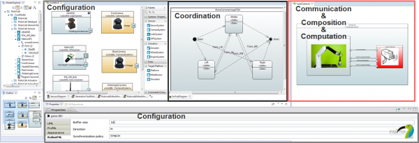 RobotML is a DSL specifically oriented to modeling and design of mobile manipulation robotic systems. RobotML conforms to RobMoSys's foundational principles of separation of roles and concerns. It provides several view points, including (but not limited to) those for the definition of State Machines, Hardware and Software components , Controllers and Environment. RobotML domain models allow for the representation of the system's architecture, control and communication aspects and span across all 5C concerns of Computation, Coordination, Coordination, Configuration and Composition.
