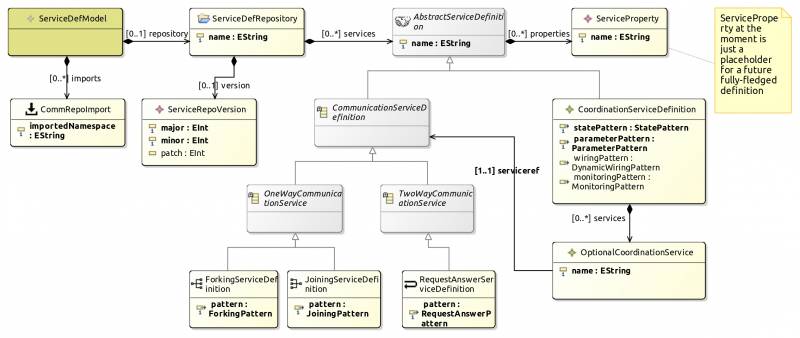 The SmartMDSD Toolchain supports in modeling domain structures (i.e., domain models) that conform to the RobMoSys composition structures defined at Tier 1 (see above). On the one hand, this means that the Toolchain internally implements the related Service-Definition Metamodel (see the Ecore diagram below) as part of Tier 1, and, on the other hand, the Toolchain provides relevant model editor (see the Eclipse screenshot below) to support the involved Service Designer role in the definition of domain models (i.e., service definitions). These domain models are used at the next Tier 3 to (a) implement components that realize specific services and to (b) compose systems by interconnecting required and provided services of related components.