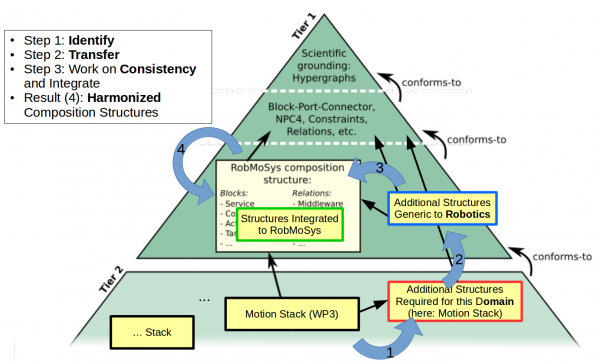 The second approach is to evolve the composition structures over time by generalizing existing domain-specific structures. In some cases, the composition structures of Tier 1 may not be sufficient or not complete for modeling in a particular robotics domain. This situation requires additional structures to be added on Tier 2. However, many of these structures tend to be generally applicable or may be generalized such that they become domain-independent and finally part of the composition structures. This is illustrated in the figure below.