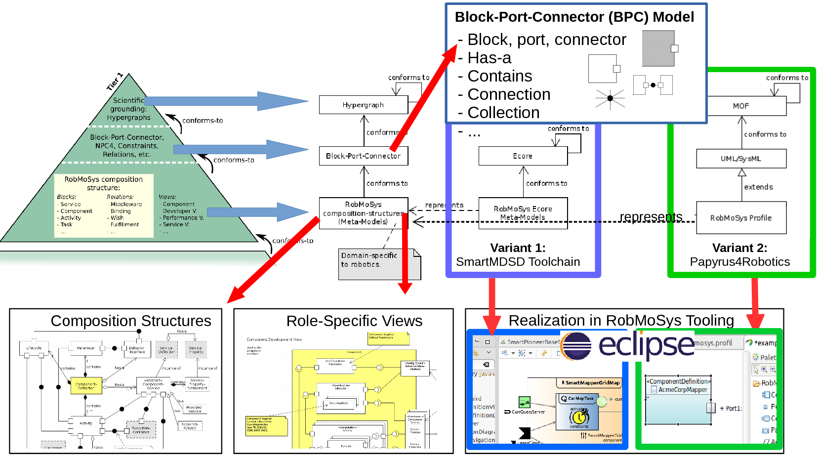 The next level on Tier 1 is the definition of blocks, ports and connectors as a general meta-level that allows definition of any domain-specific meta-model such as e.g. the RobMoSys composition structure (see below).