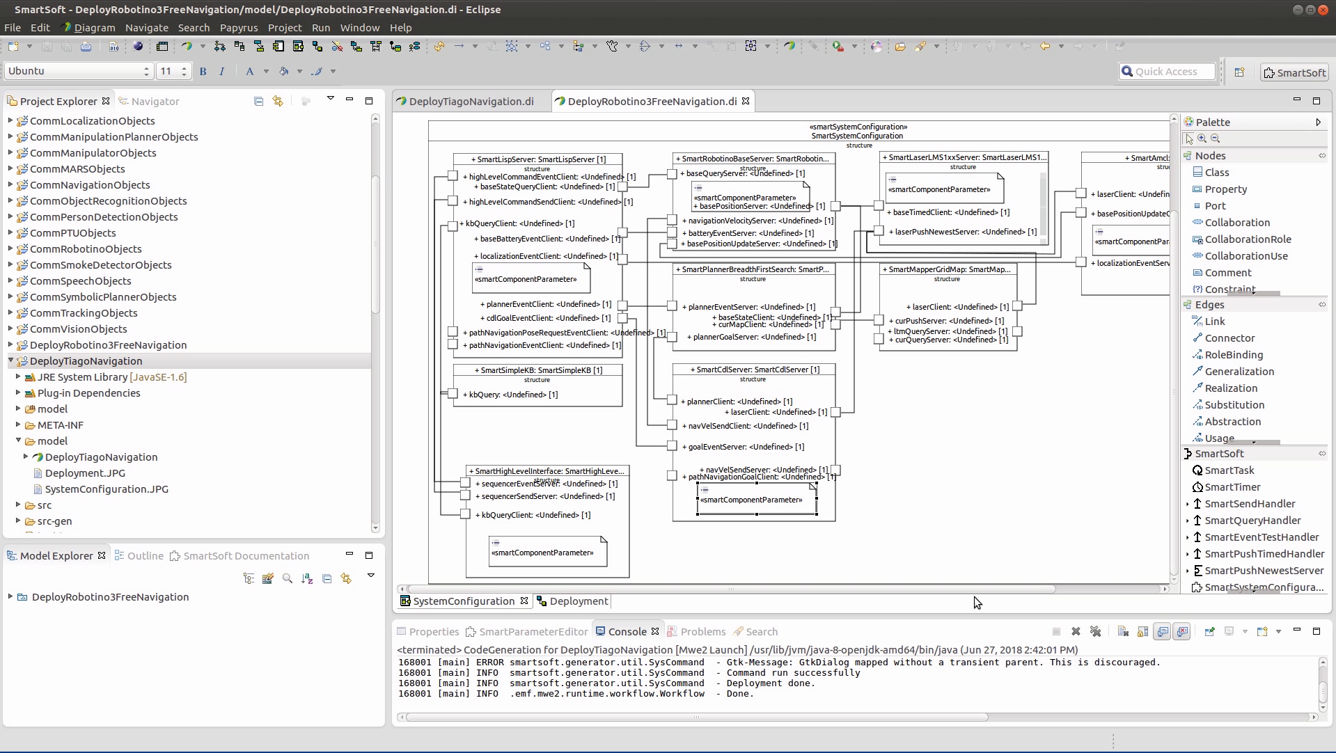 The figure included below shows a screenshot of the system component architecture diagram, as modeled in the SmartMDSD Toolchain. The system was composed from previously developed software components.