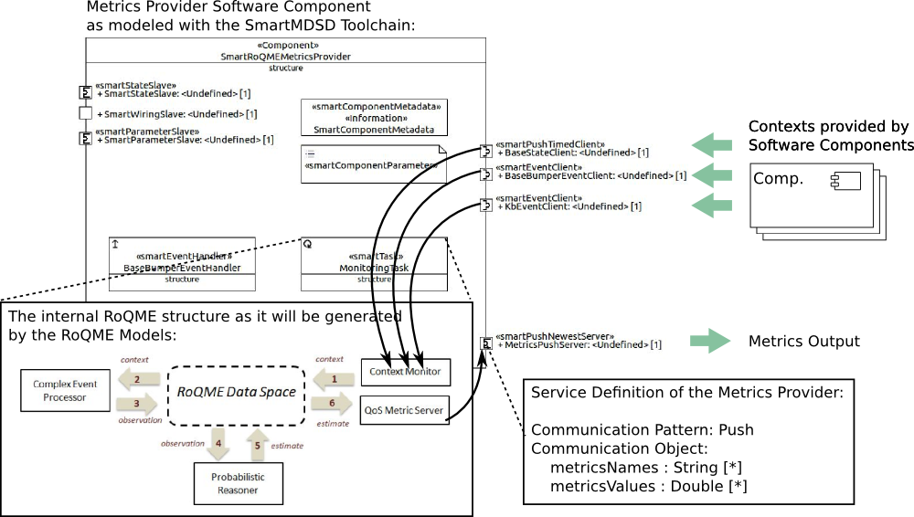 The following picture shows the QoS Metrics Provider component used in the demonstration. The hull of this component was developed using the SmartMDSD Toolchain, while its internals were manually implemented using the support software libraries developed in RoQME for context monitoring, complex event processing, and metrics estimation. Further developments in RoQME will realize the full generation of this component based on the RoQME models (see roadmap). As illustrated in the picture, the component receives contexts from other components in the system (context providers) and processes them according to the RoQME approach (lower left). It then provides the estimated QoS metrics to other components for further processing or adaptation (e.g., by the Sequencer).