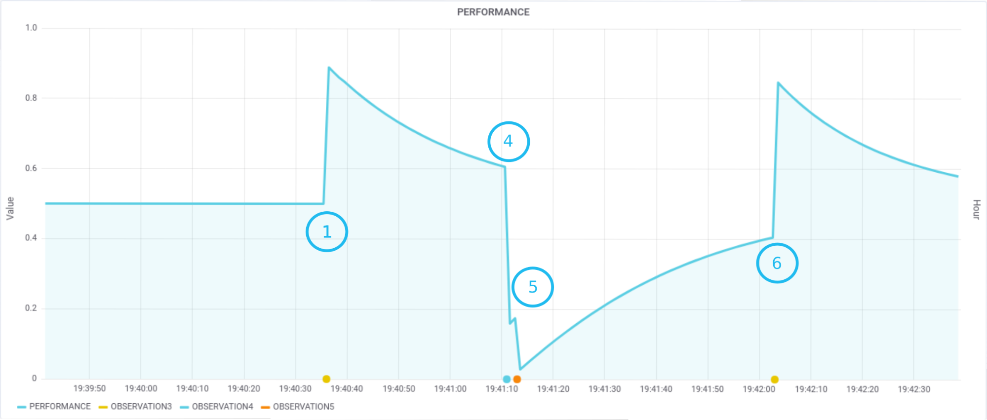 6. The robot is ordered a new task (Job_State::STARTED) which is successfully completed (Job_State::FINISHED) ⇒ Observation O3 is fired and PERFORMANCE improves.