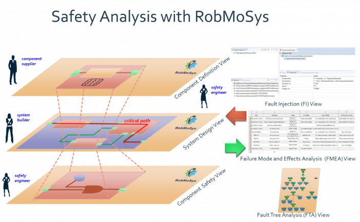 The safety analysis and validation steps are fundamental aspects to perform the safety assessment. Some of the commonly used risk assessment methods are Preliminary Hazard Analysis, Hazard Operability Analysis, Failure Modes and Effects Analysis and Fault Tree Analysis. Furthermore, fault injection simulations complete these analyses by finding unexpected hazards (fault forecasting) and verifying the implemented safety mechanisms. Figure 2 illustrates how safety analysis is related to RobMoSys’ views.