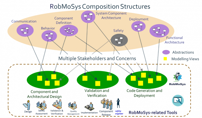 The RobMoSys project defines structures which enable the management of the interfaces between different robotics-related domains, levels of abstraction and roles. eITUS will broaden the ecosystem by considering safety aspects such as the development of a safety view and the introduction of a new role called safety engineer (cf. Figure 3).