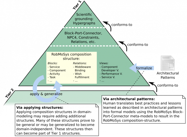 The second approach is to evolve the composition structures over time by generalizing existing domain-specific structures. In some cases, the composition structures of Tier 1 may not be sufficient or not complete for modeling in a particular robotics domain. This situation requires additional structures to be added on Tier 2. However, many of these structures tend to be generally applicable or may be generalized such that they become domain-independent and finally part of the composition structures. This is illustrated in the figure below.