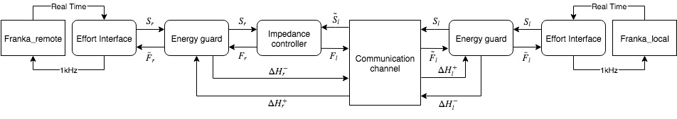 Franka Emika Panda robotic arms are used, which are controlled in real time through their control cabinets, the Franka Controller Interface (FCI). The local robot (Franka_local) is held by the operator and services as haptic device. The remote robot (Franka_remote) is the teleoperated robot that is located at the remote site. The effort interfaces are written for the Franka robots specifically. They communicate with the FCI’s in a monitored 1kHz loop. If this loop is broken, the robot will apply its safety brakes. In this loop, the effort interface writes torque commands to the actuators and receives information on the robot’s state in real time.