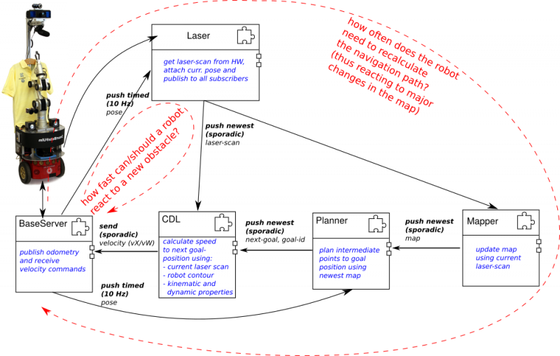 The example system in the figure above consists of five navigation components, from which two are related to hardware devices (i.e., the Pioneer Base and the SICK Laser) and the other three components respectively implementing collision-avoidance (i.e., the CDL component), mapping and path-planning. As an example, two performance-related design questions are introduced in the following with the focus on discussing the architectural choices and the relevant modeling options: