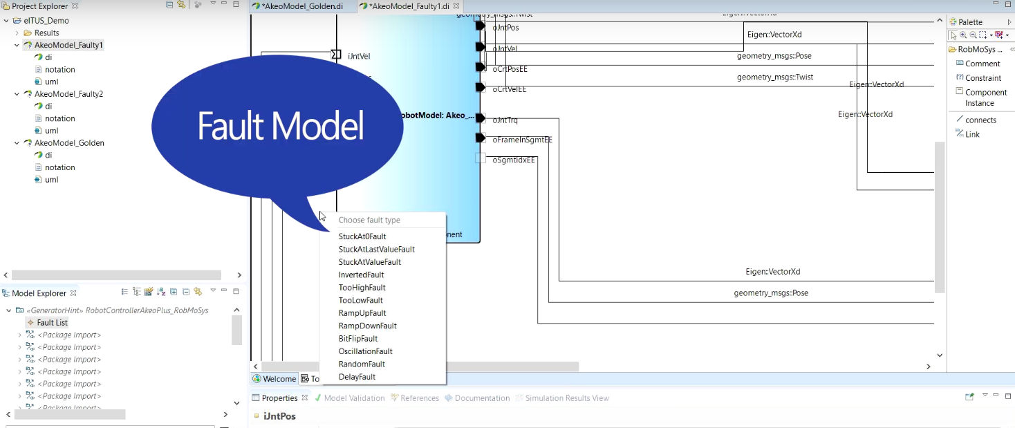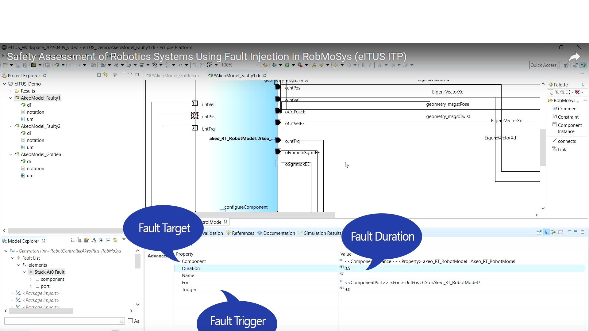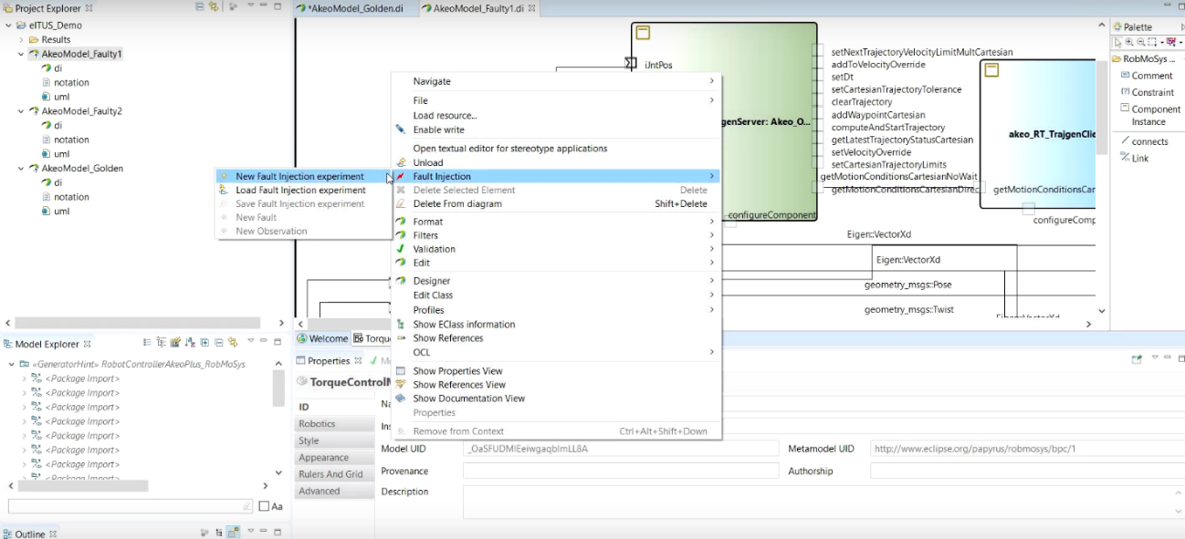 The fault injection view can be used together with the FMEA, FTA and safety requirements view to complement or verify those analyses. Regarding the fault injection view, the eITUS framework sets up, configures, executes and analyses the simulation results. Model-based design combined with a simulation-based fault injection technique and a virtual robot poses as a promising solution for an early safety assessment of robotics systems.