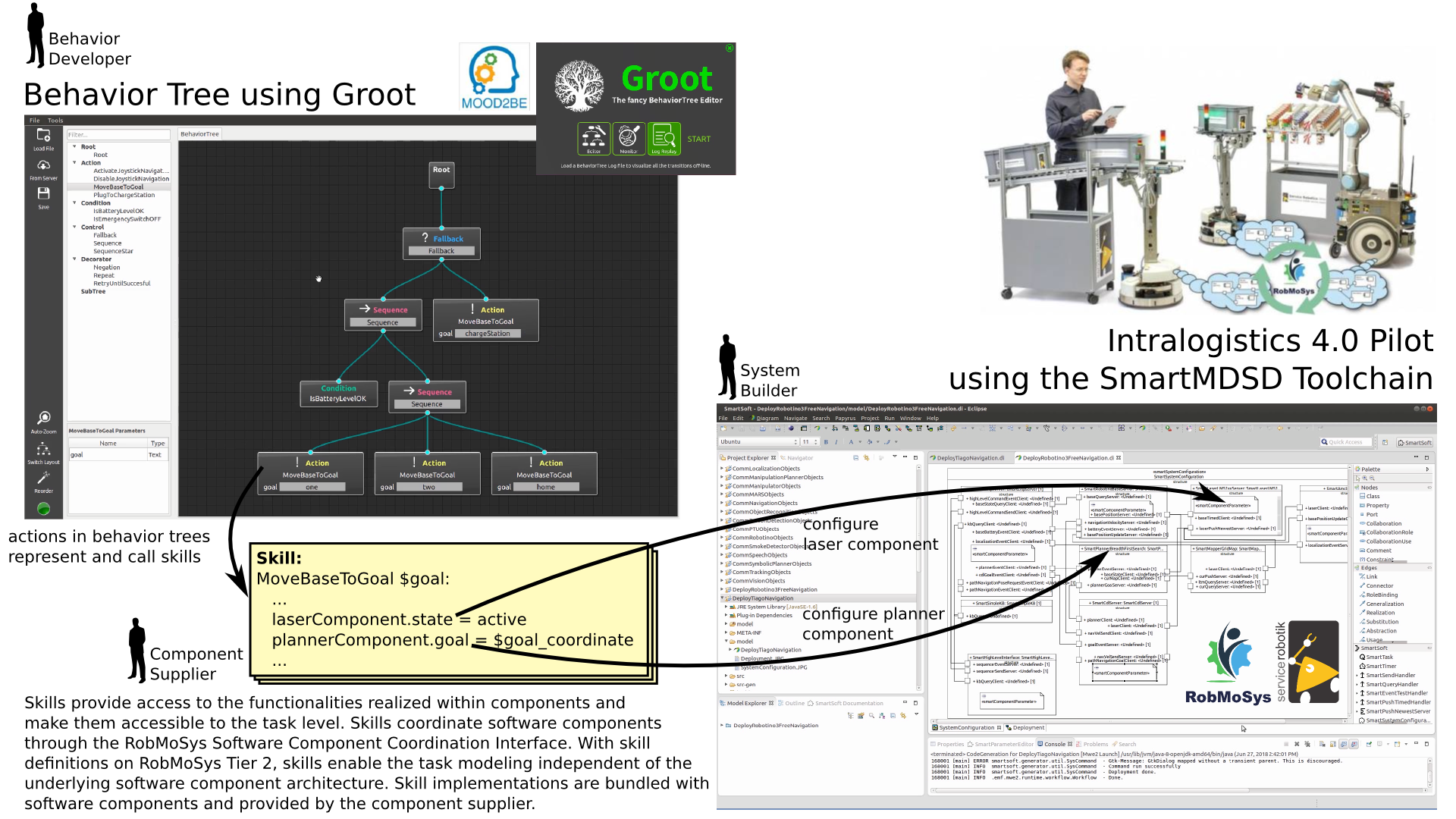 A previous version of this demonstration as of June 27 2018 focused on the technical feasibility of behavior trees communicating with components from the SmartMDSD Toolchain. At that time, it was manual effort by the system builder to “connect” the behavior engine with software components. This manual effort is now replaced by a full model-driven workflow and interaction between component supplier, system builder and behavior developer roles.