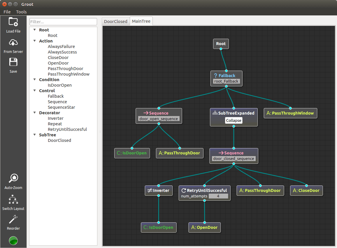The below screenshot shows Groot in action while editing a behavior tree: