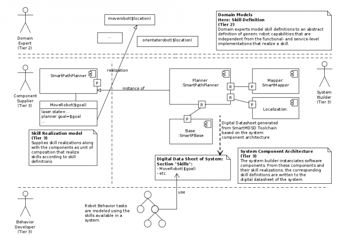 The separation of the skill definition, modeling the interface and the skill realization enables the replacement and the composition of components (providing the same skill) and decouples the component from the Behavior Developer and the technology used to realize robotics behaviors on task level. The role of the Domain Expert therefore is able to define skill definitions modeling the interface of skills on tier 2, not yet deciding how a skill is realized. As a result, the skill definition is any component that realizes it.