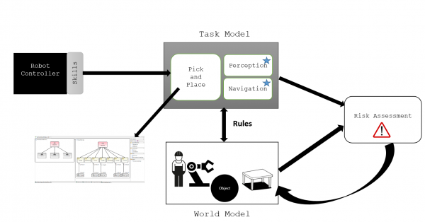 The pilot demonstrates task and environment definition for a human-robot collaboration use case: Pick and Place through RobMoSys tools. The interaction between the robot and the operator is direct (with no fences) for carrying a heavy object from a given starting position to a target one.