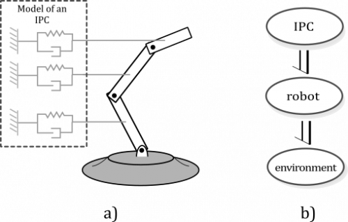 Energy-based control is a model-driven loop control strategy for multi-domain physical systems, such as robotic applications. This method relies on the exchange of energy among components to perform a specific controlled action. An energy-based controller is modeled as a dynamic system that exchanges energy with the plant [5]. This allows a robot to interact with the environment by shaping the energetic behaviour to take a desired form. Such an idea leads to formulate Intrinsically Passive Controllers (IPC), which are control components that exchange power while preserving passivity. The Figure 2 is a representation of an IPC controlling a robotic arm; the IPC is modeled as a set spring-damper elements that exchanges energy with the robot.
