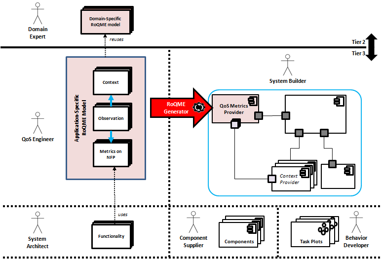 • RoQME domain-models defined at tier-2 can be (re-)used in a variety of concrete tier-3 applications (e.g., standard metrics on safety defined in the context of mobile robotics can be reused/refined as standard metrics in the context of intralogistics, and these, in turn, reused/refined in different particular intralogistics applications).