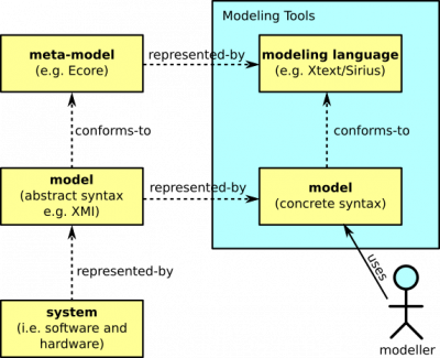 There is a subtle relationship between the (meta-)models, the actual modeling languages and the concrete models. This relationship is depicted in the figure below.