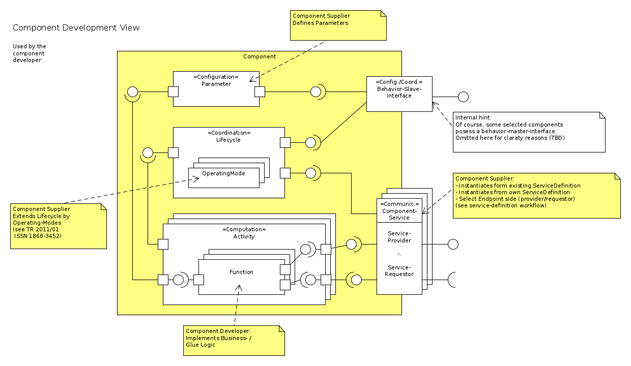 The component development view (shown in the figure below) needs to be rich enough and provide sufficient structures such that this model can serve as a consistent baseline for all the successive development steps (such as e.g. system composition/configuration) that rely on proper component models. At the same time, the component development view should avoid definition of too many low level details that are more related to internal knowledge that is not required for supporting composition with respect to the surrounding models. In this way, the component development view always is a trade-off between providing enough structures where needed and leaving enough design freedom for the internal realization.